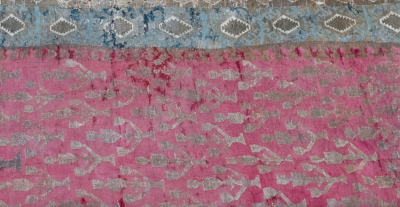 Besonders hervorzuheben ist hier das Lila im Zentrum des Musters, das etwa 180 Jahre alt ist und die Langlebigkeit sowie die Tradition natürlicher Farbstoffe widerspiegelt.