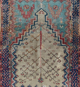 This carpet, with its candlesticks in the mihrab, is an intriguing piece. Despite its wear, tears, and stains, I deeply loved this carpet, which inspired me to research the characteristics of the relevant period and sit down at my writing desk. Perhaps its mystery captured my interest—I’m not sure. What I do know is that the value of this unique carpet is priceless. I can almost hear my grandmother’s voice: “Silk, pure silk.”